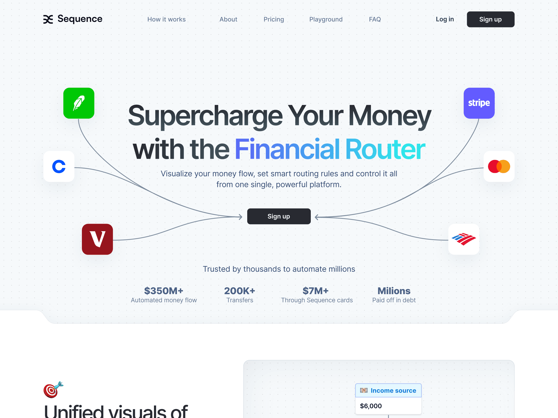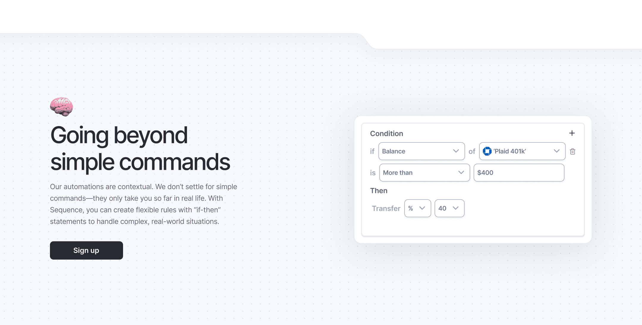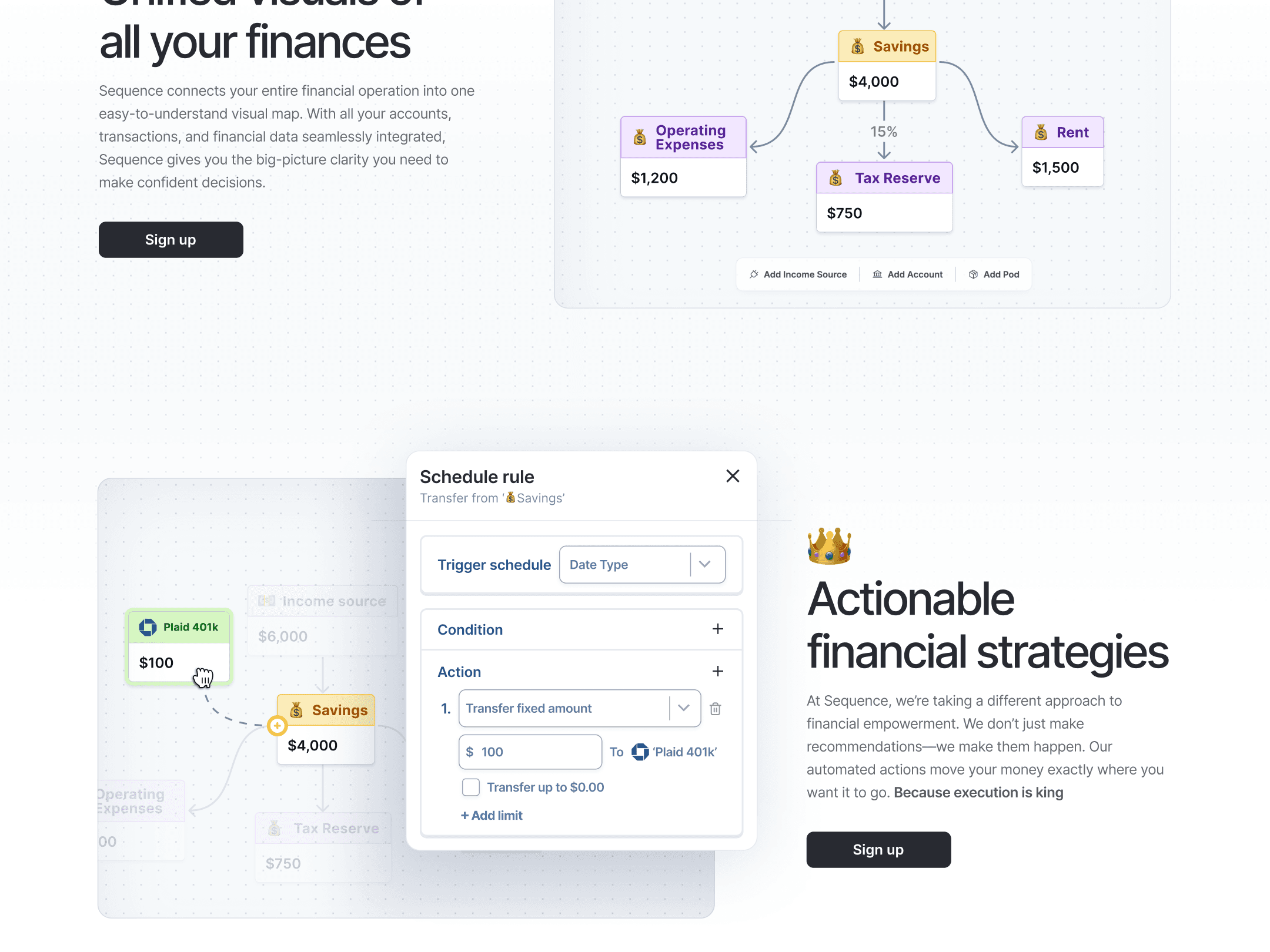 Working with Sequence, an innovative fintech startup, I developed a visual system that progresses naturally through their three main value propositions: unified financial visualization, actionable strategies, and contextual automation. The design needed to speak to busy entrepreneurs who manage multiple financial accounts and automated workflows, making complex operations feel approachable yet powerful.